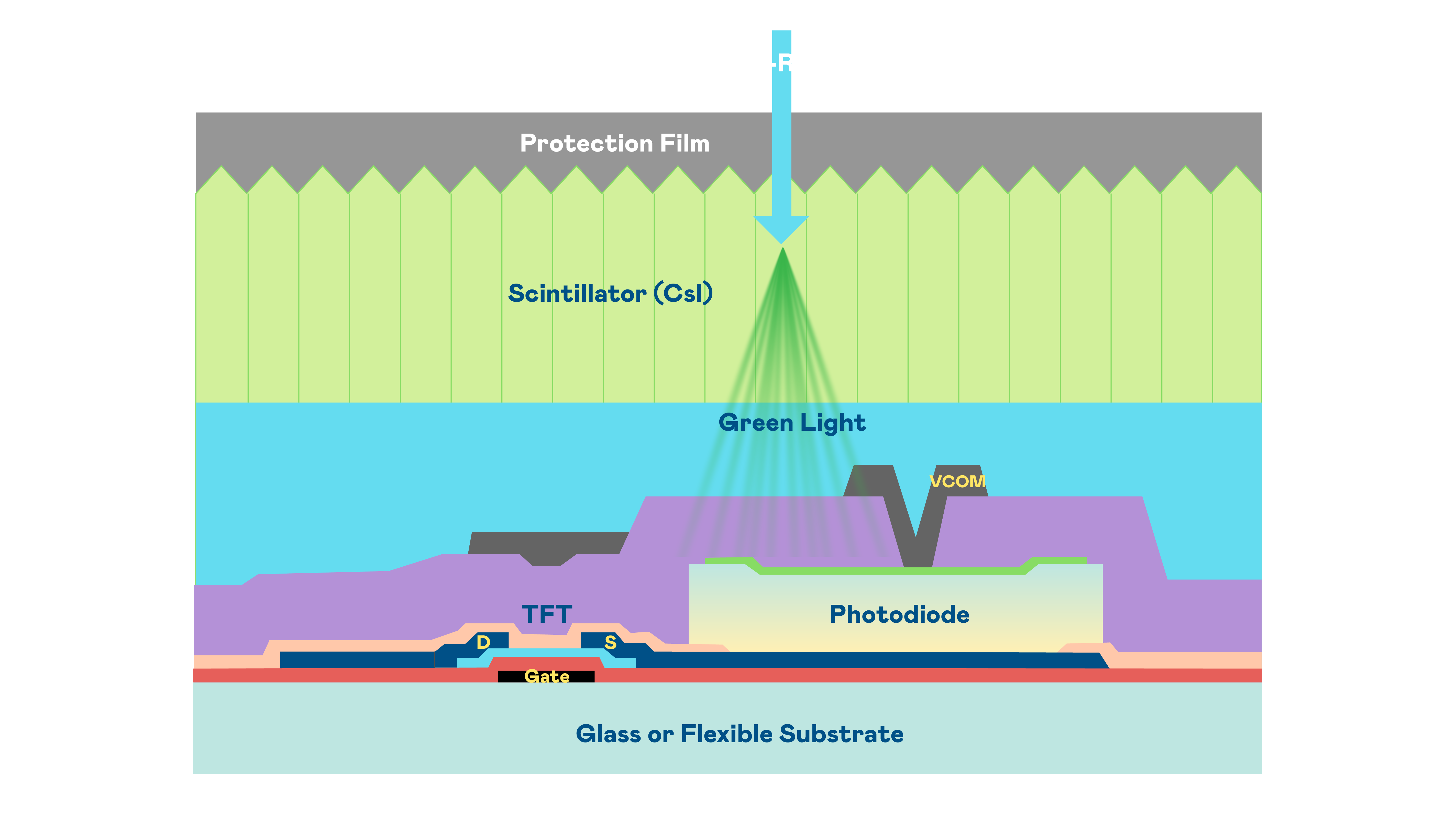 云顶集团3118的X光影像感测阵列使用薄膜电晶体 (TFT) 作为每个像素的读取开关,搭配光电二极体(Photodiode)的光电转换元件,用以感测X光影像讯号。
